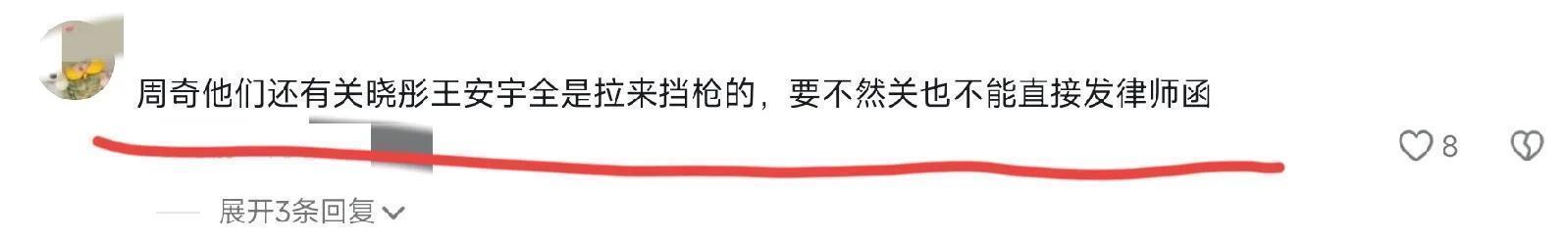 网友:周奇他们还有关晓彤王安宇全是拉来挡枪的,要不然关也不能直接发律师函。
