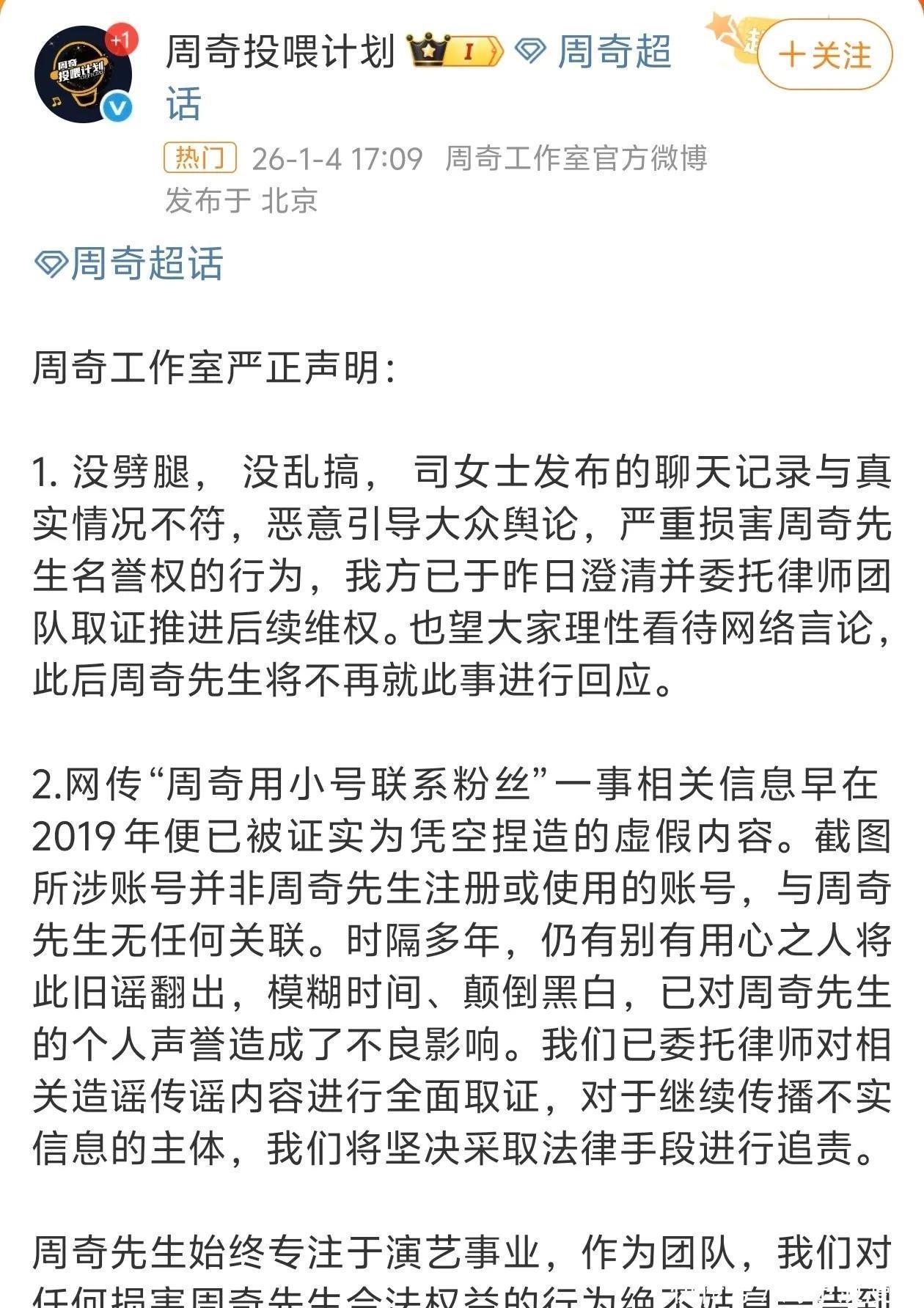 紧接着司晓迪又放出了他们的聊天记录,虽然周琦和他的工作室迅速发了声明,直接否认了相关传闻。
